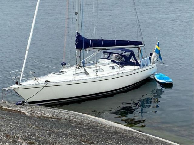 Direkt till babord om nedgångstrappan finns ett längsgående pentry med spis med ugn och dubbla diskhoar. Akter om pentryt finns ingång till kläd- och segelförråd. Till styrbord om nedgångstrappan finns navigationsplats med separat sittplats vänd i färdriktningen. Akter om navigationsplatsen finns ingång till en akterkabin som består av en dubbelkoj och en garderob. Salong med längsgående soffa till babord och L-formad soffa till styrbord (soffornas längd är 2 meter). Mellan salong och förpik finns garderob till babord och toalett med dusch till styrbord. Traditionell förpik med två kojer (2,05 meter långa).